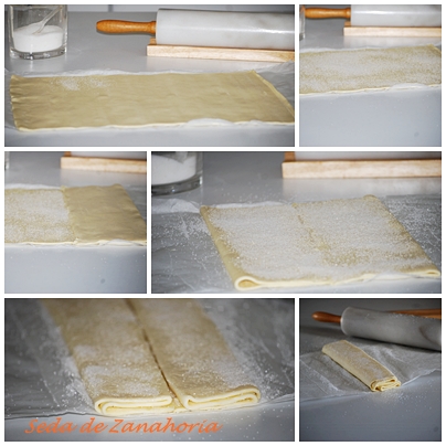 Os dejo en imagenes como voy doblando el hojaldre para que de un vistazo os hagáis a la idea de como hacerlo, eso si, siempre espolvoreando el azúcar antes de volver a doblar y pasando el rodillo muy suavemente para que se quede incrustado en la masa pero sin apelmazarla.