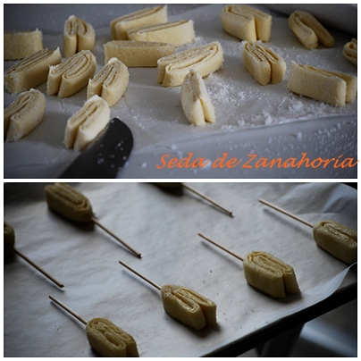 Una vez que tengamos la masa cortada en trozos de 1 cm., los depositamos en una bandeja con papel de horno y los pinchamos con los palitos de brocheta, lo introducimos en este a 200º unos 8 min. le damos la vuelta y otros 2 min.