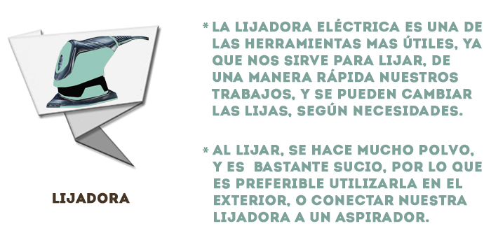 - Al lijar se crea mucho polvo, por lo que es recomendable, ponerse gafas y mascarilla, y si la máquina lijadora, tiene un tubo que podamos conectar a un aspirador, es mucho mas limpio y cómodo.