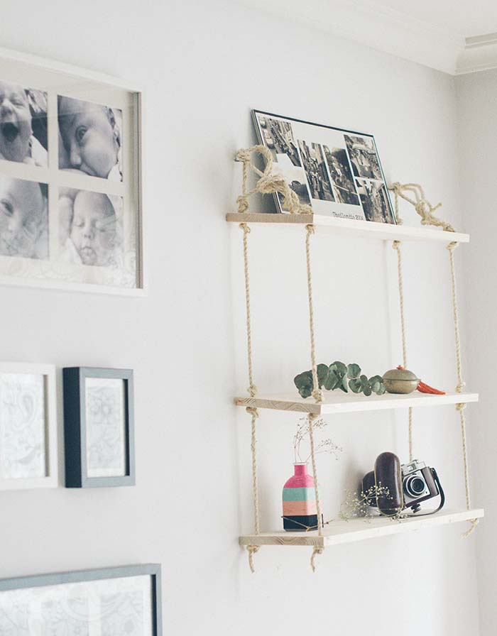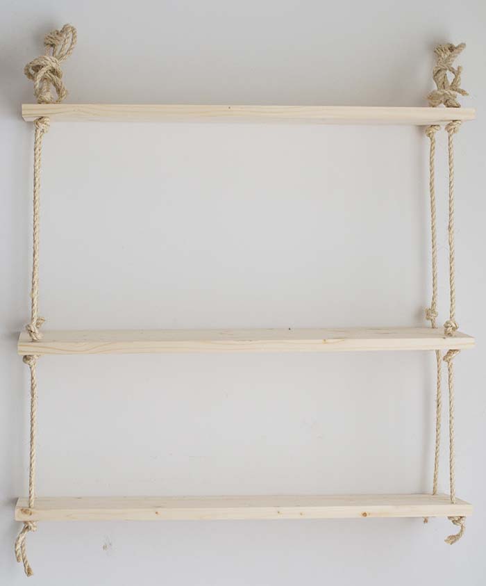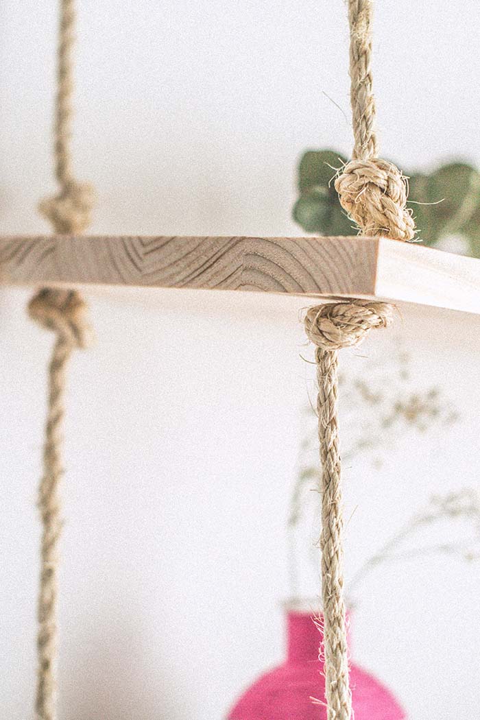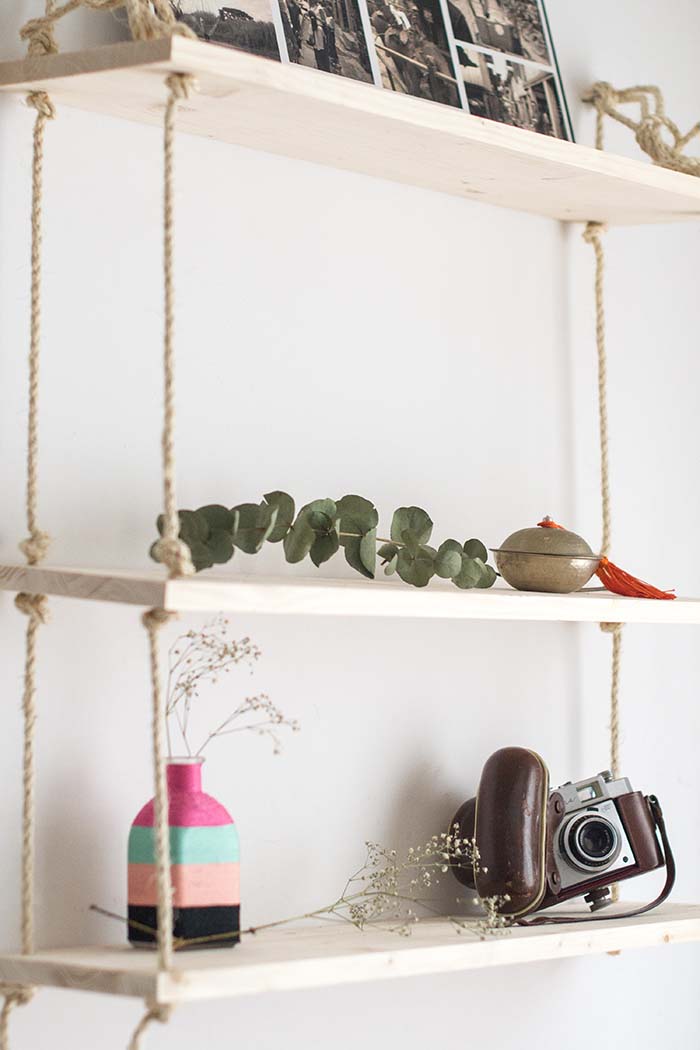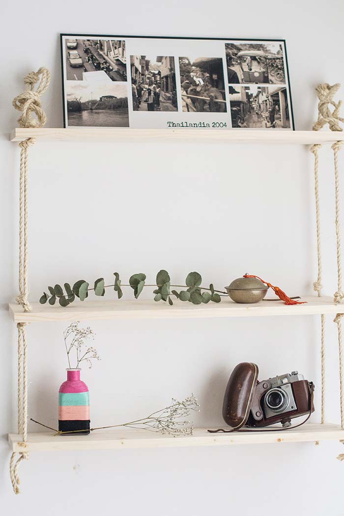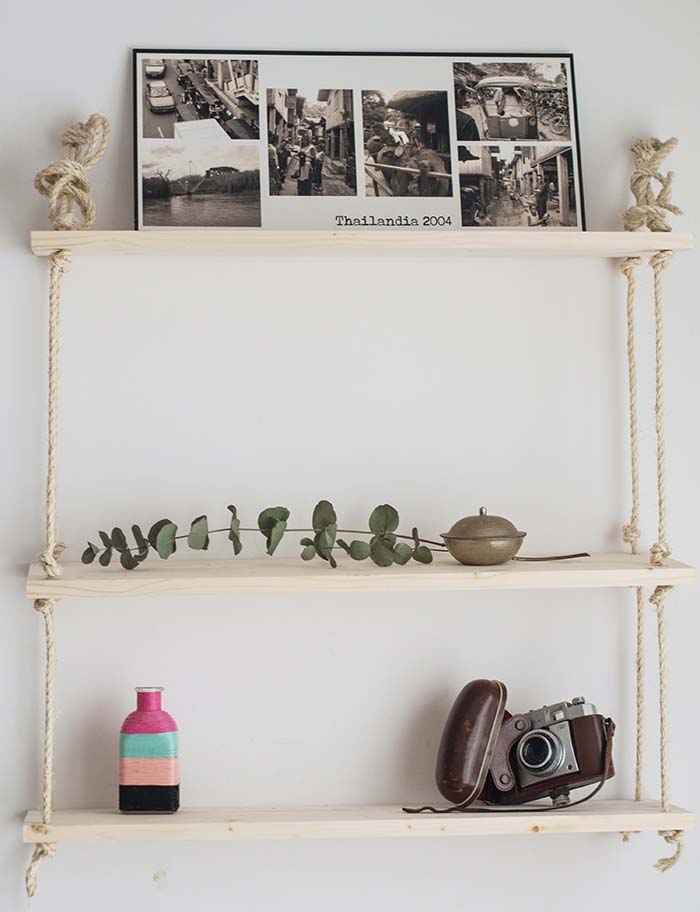 y con esto nos hacemos una estantería con soga y baldas de madera de lo mas molona!