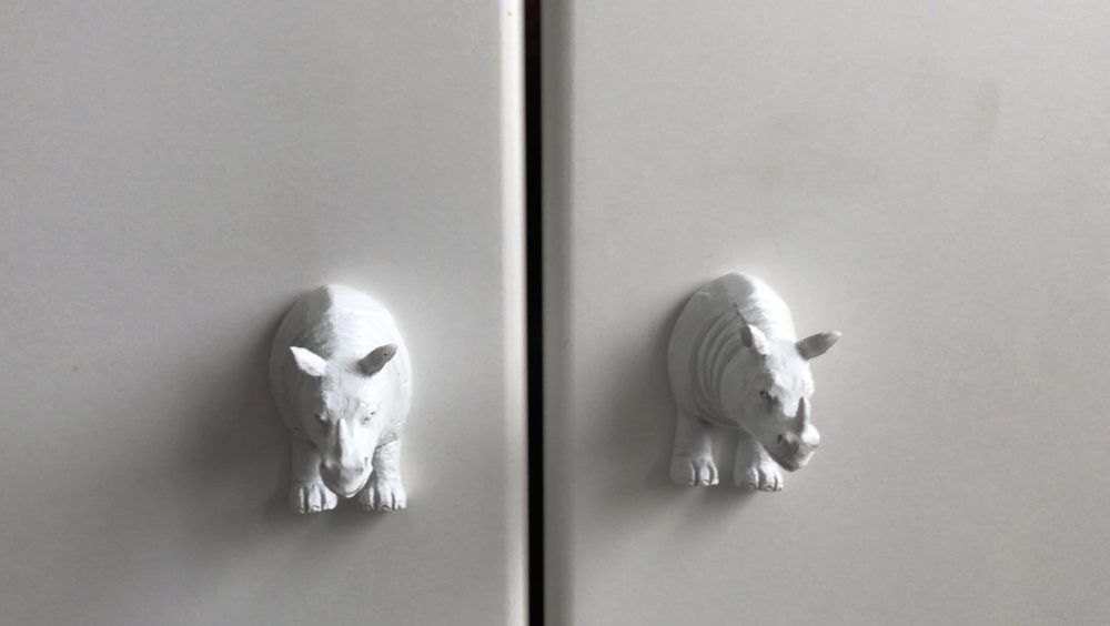 Tambien lo hemos hecho con los tiradores del banco con cajón y los armarios, que los hemos cambiado por diferentes elementos de la selva; unas lagartijas, palmeras tropicales y unos rinocerontes.![]()