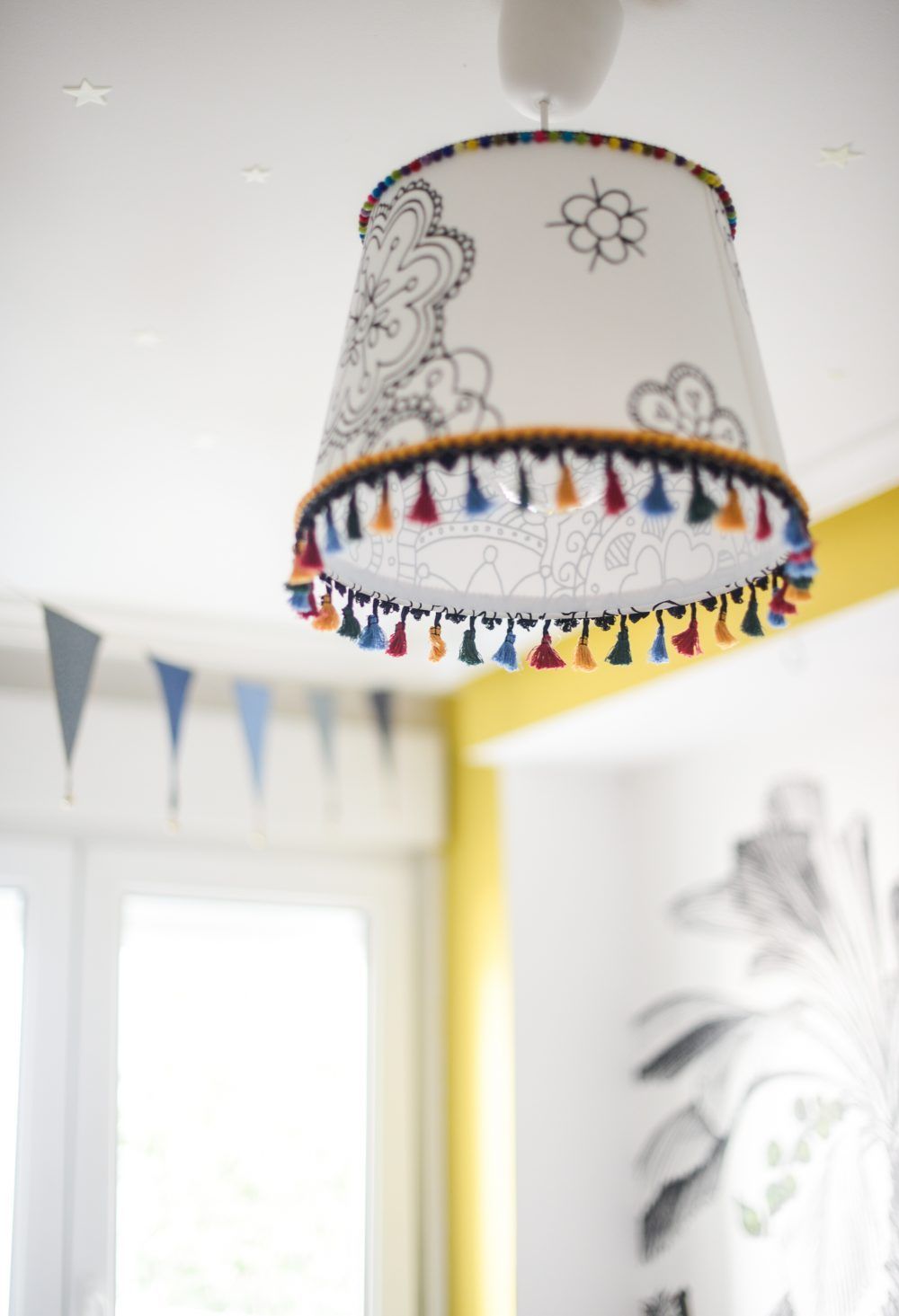 La pantalla de la lámpara , también se ha customizado fácilisimamente, añadiendo unas tiras compradas en la mercería de borlitas de colores, y otras de pompones, y la verdad que ha quedado super resultón, y para ello hemos utilizado pegamento textil, asi que mas fácil imposible..