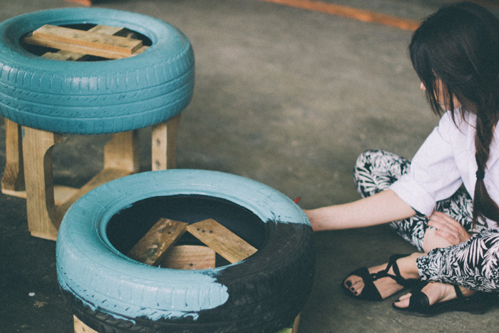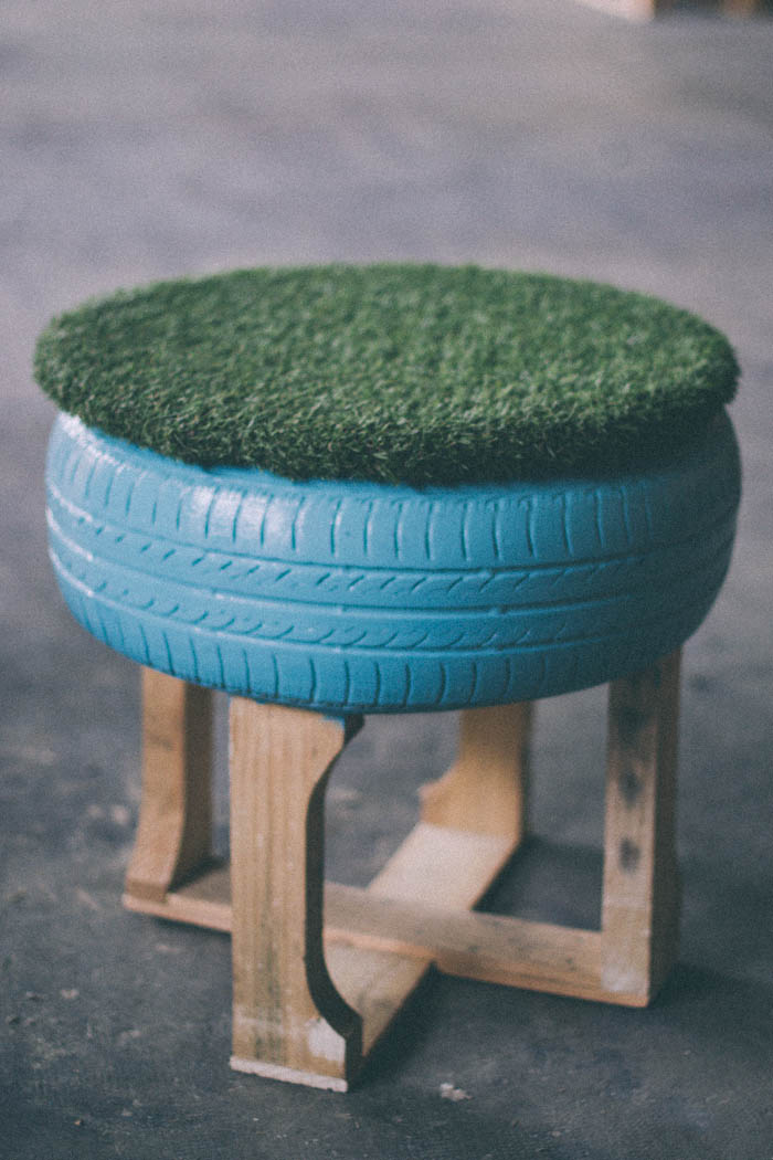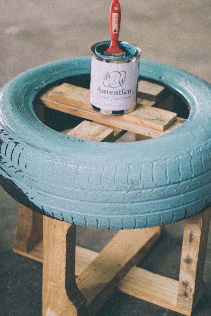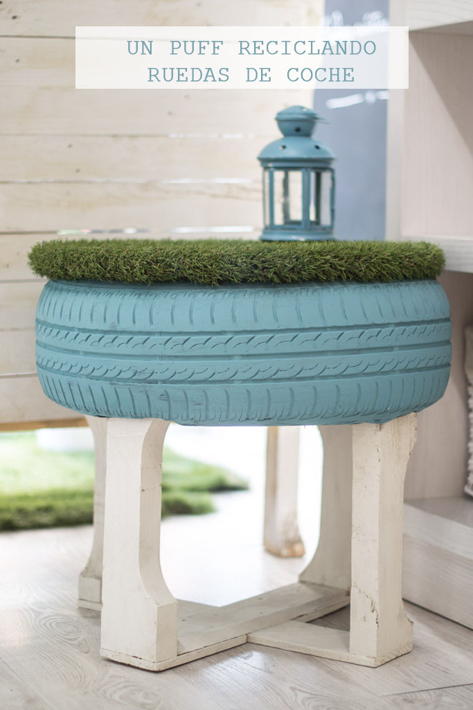 Y algo que hemos hecho para esta decoración, han sido unos Puff con neumáticos, que decoramos pintandolos con autentico chalkpaint y con un poco de césped artificial!