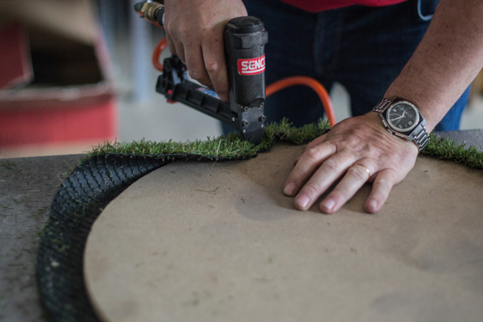 Cuando acabamos de pintar las ruedas, nos pusimos con el tapizado,con un poco de césped artificial y la pistola neumática, forramos la tabla de nuestra base para el puff.