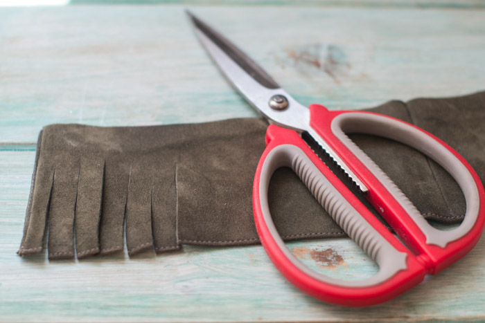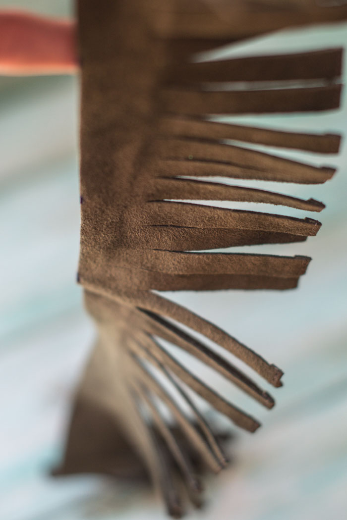 Cuando tenemos nuestros flecos, hechos, vamos pegándolos con ayuda de la pistola de cola caliente, en la zona mas baja de la bota, (casi a la altura a ras del suelo, para que quede a modo de faldón).