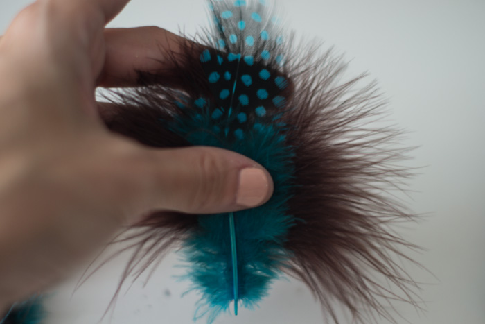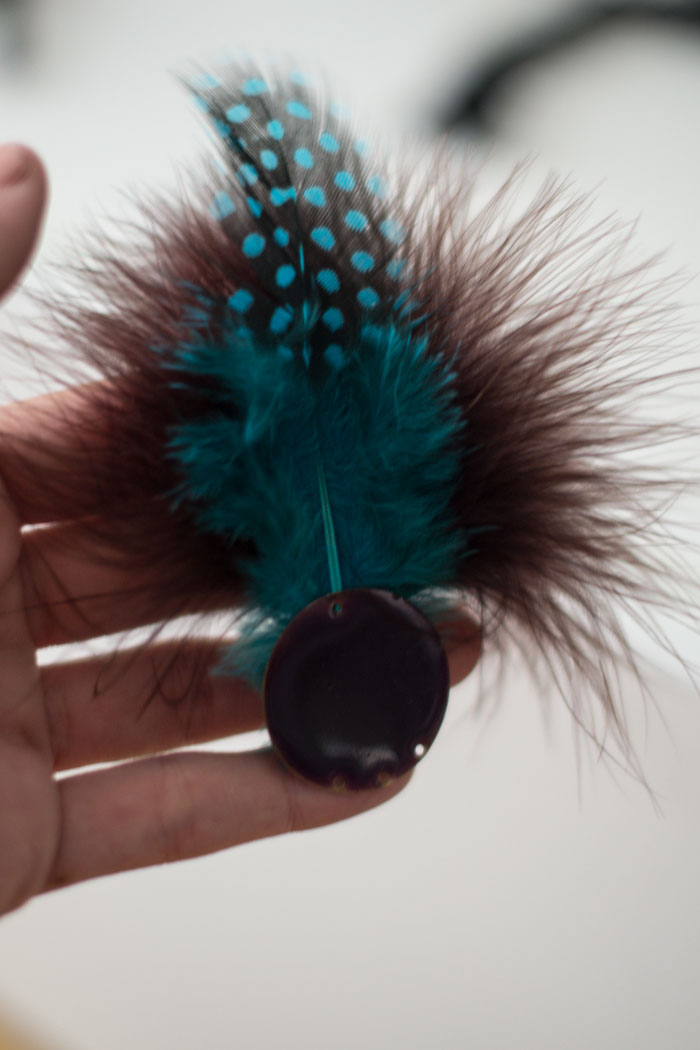 Y después de hacer estas fotos, le añadí las plumas que finalmente compré, pegándolas con la pistola de cola caliente.